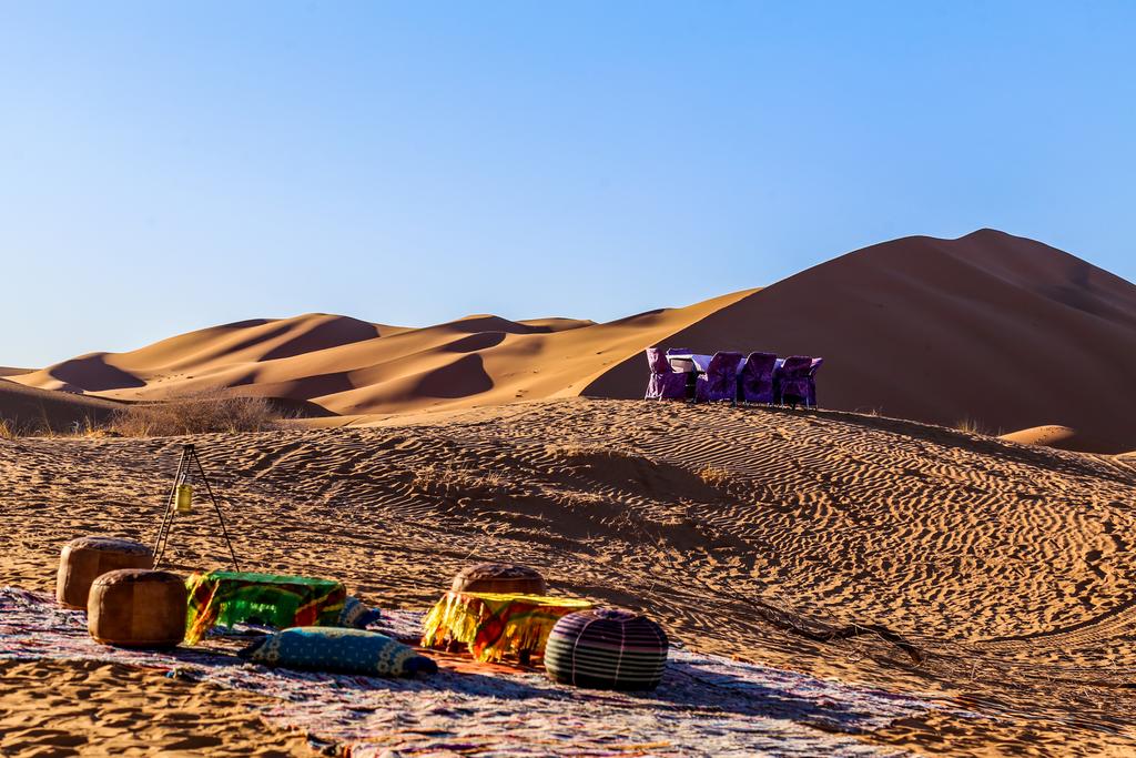 Por la mañana, conduzca a través de las dunas de arena pasando por fabulosos paisajes al borde de Erg Chebbi, la duna de arena más grande de Marruecos. Verás muchas tiendas negras nómadas en medio de la nada. Pase por una familia nómada para tomar el té y ver cómo es la vida nómada. Descubrirás la vida nómada de los tuaregs visitando Khamlia, un pueblo donde nada ha cambiado durante siglos. Almuerzo en el pueblo de Khamlia o en su hotel. Después de un breve descanso, daremos un paseo en camello para conocer uno de los sitios más fascinantes que verá, la hermosa puesta de sol en medio de las altas dunas de arena de Merzouga. Pase la noche en una tienda de campaña en un campamento bereber del desierto para contemplar el hermoso cielo estrellado.