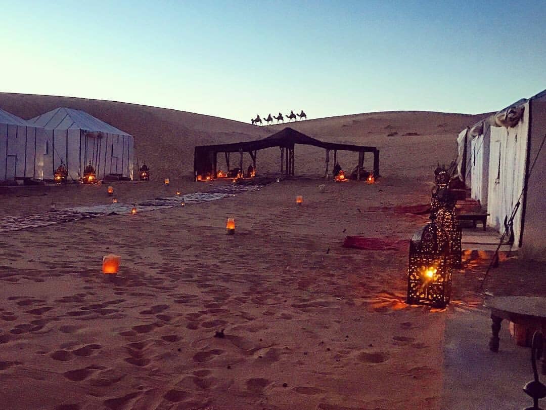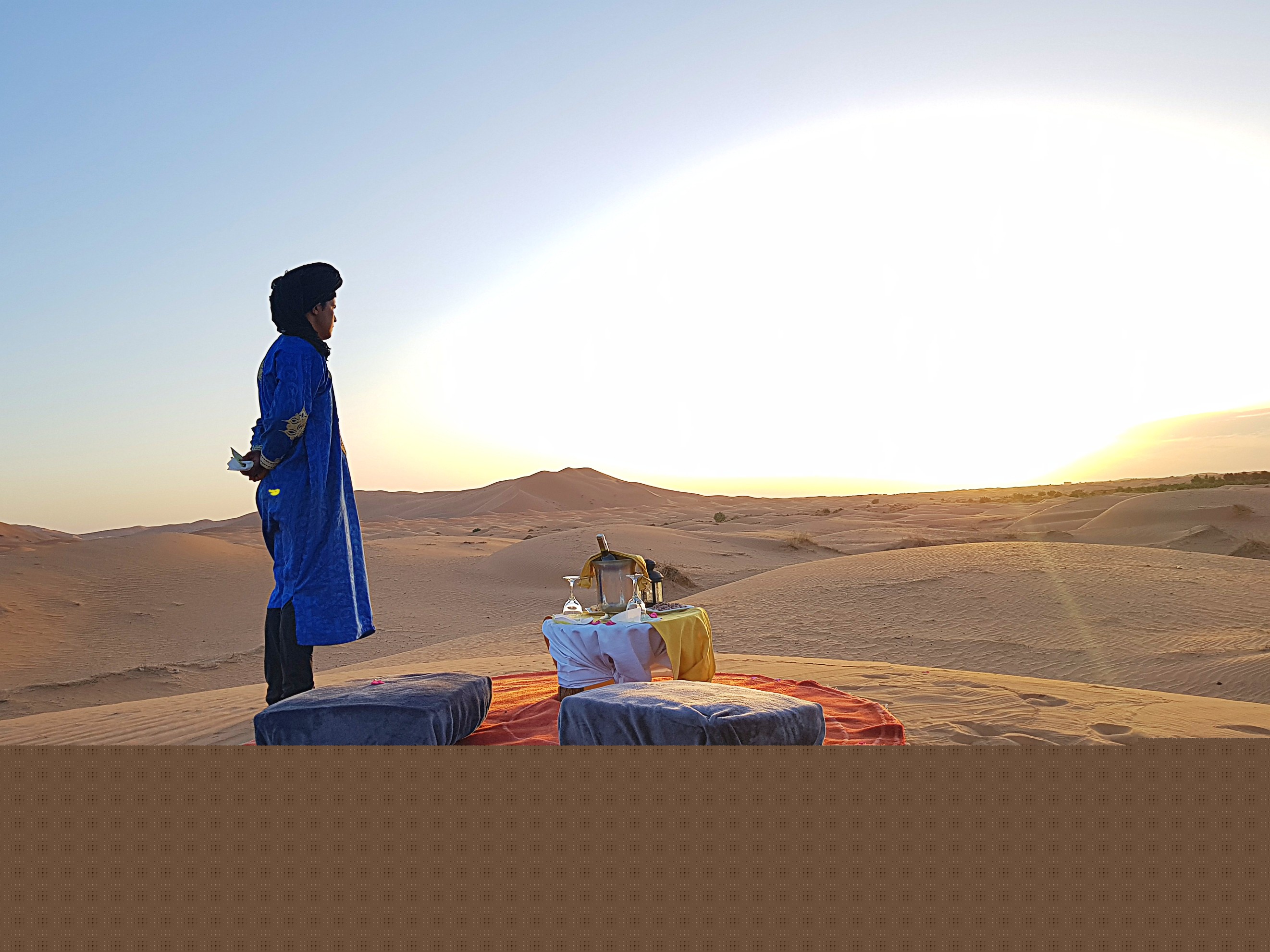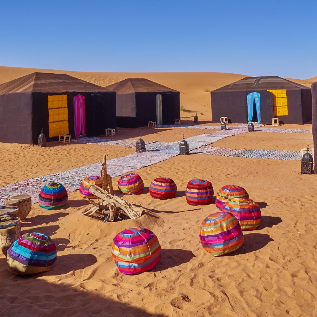 El pequeño oasis de Merzouga se encuentra en los límites de Erg Chebbi, la mayor cadena de dunas de Marruecos. Aquí residirás en una Kasbah justo en el corazón de las dunas. Al atardecer tendrás la oportunidad de disfrutar de una visita guiada por el desierto a lomos de un camello. Como un bereber, pasarás la noche en una tienda de campaña en medio de las dunas.