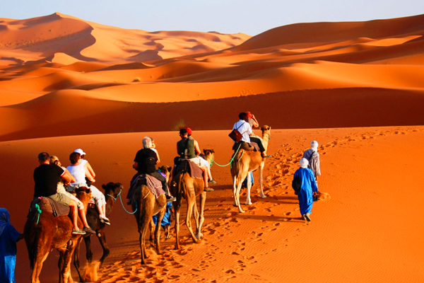 Esta mañana, usted tendrá que caminar alrededor de las plantaciones de palma y disfrutar de las vistas panorámicas del río Todra . Más tarde, nos dirigimos hacia Tinjedad para un almuerzo en un restaurante local. Más tarde pasará por varios pueblos como nosotros Touroug (pueblo bereber) y El- jarf antes de llegar a Erfoud . Usted visitará un taller de artesanía fósil local. Después de que usted continuará a las dunas de Erg Chebbi cautivadoras , estas dunas se llaman también Merzouga Dunes. Llegada al hotel y prepárate para un viaje en camello por una hora y media para disfrutar de la puesta de sol. Mientras que en la parte posterior de su dromedario , continuará hasta el campamento o una noche en tienda nómada tradicional. Cena y pasar la noche en un vivac en el medio de las dunas.